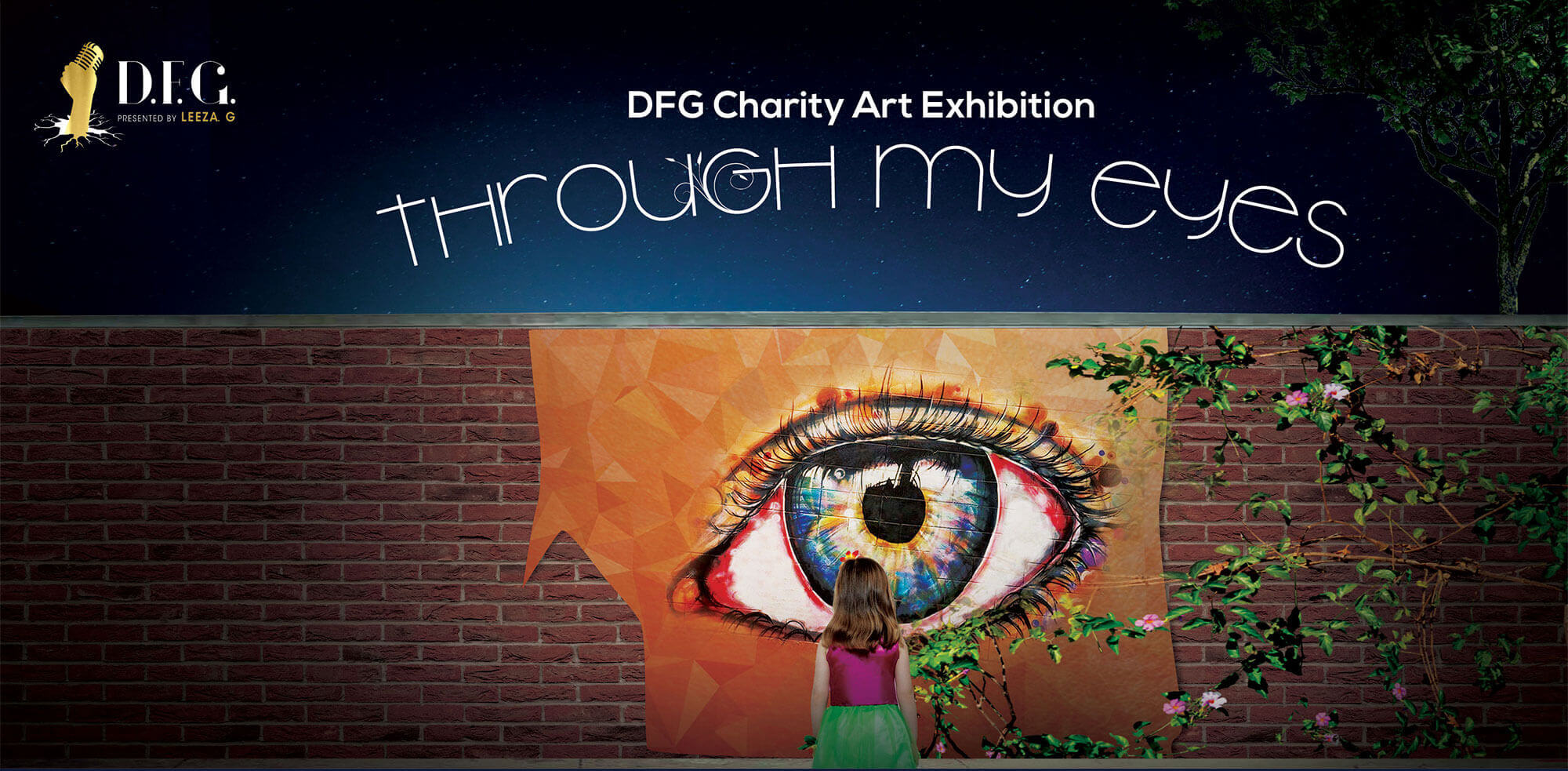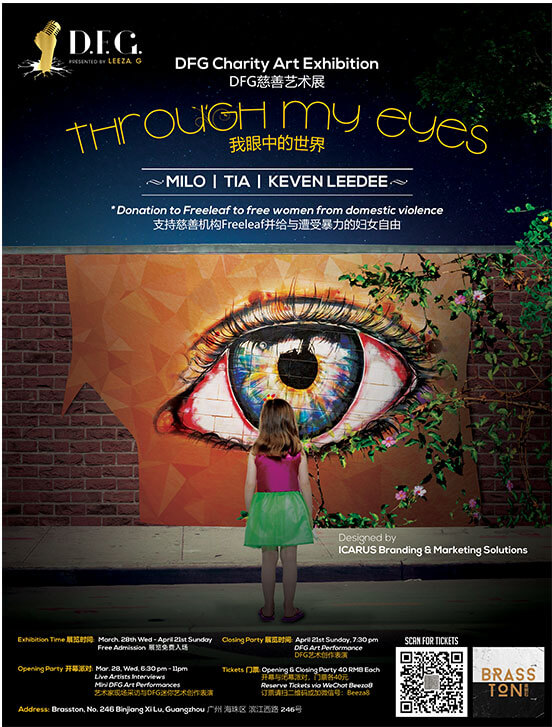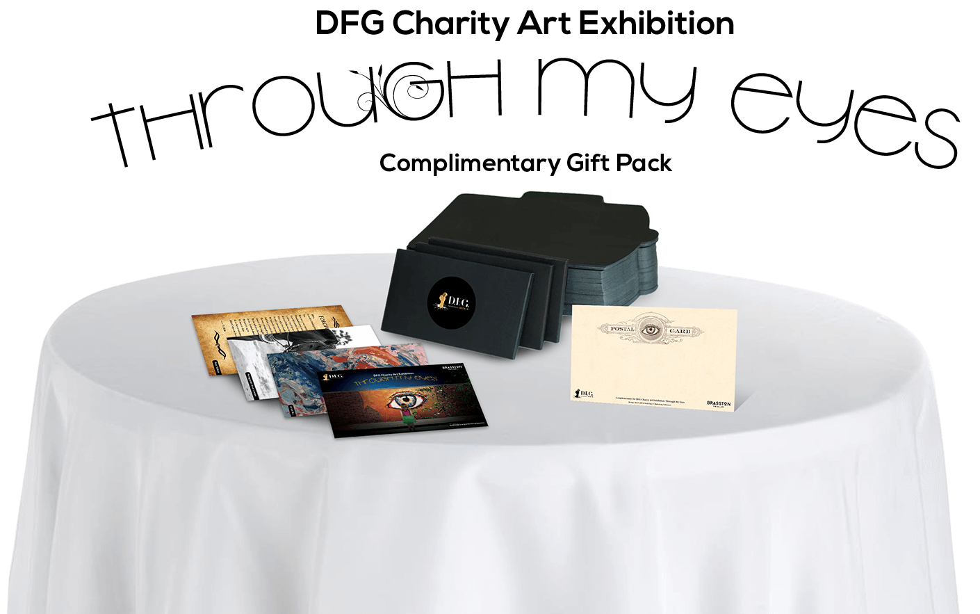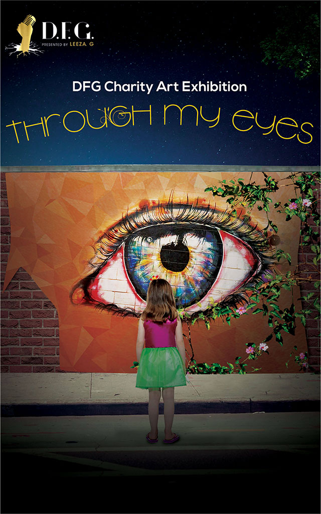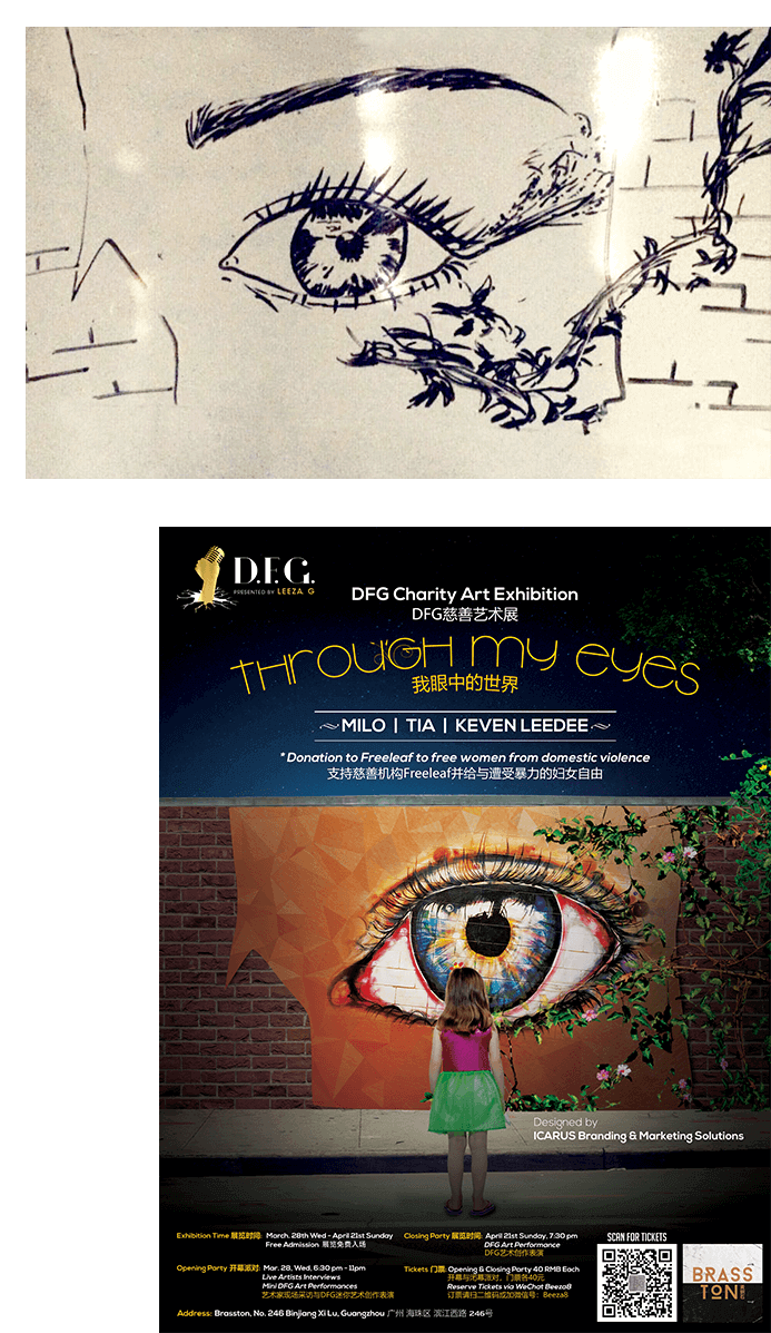"Through My Eyes" Art Exhibition consisted of art work from three artists to express their views through their eyes. Inspired by the art work of the artists, the inspiration the main visual features a little girl gazing at the eye on a brick wall, with a vine growing from the eye and reaching to the other side of the wall. This concept was adopted in the exhibition set up, with the eye being projected on a door into the exhibition, so all the guests will literally see and "walk" through the eye. This, of course, was followed by a complementary postcard set designed with an art piece from each artist for the guest to take away.